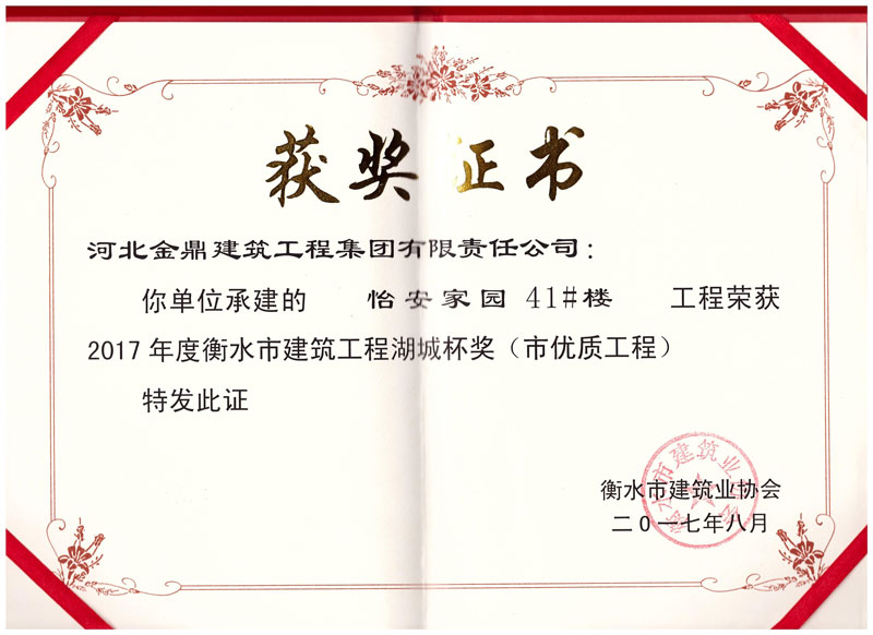 怡安家園41#樓工程榮獲2017年衡水市建筑工程湖城杯獎(市優(yōu)質(zhì)工程)