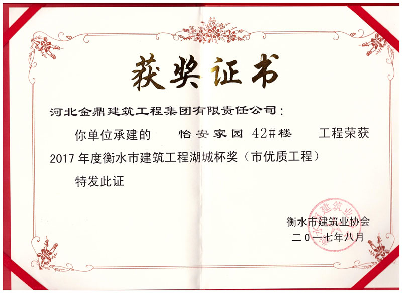 怡安家園42#樓工程榮獲2017年衡水市建筑工程湖城杯獎(市優質工程)