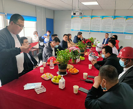 在會議室召開慶祝封頂會議,項目經理侯紅磊匯報項目施工情況,總監理工程師講話。